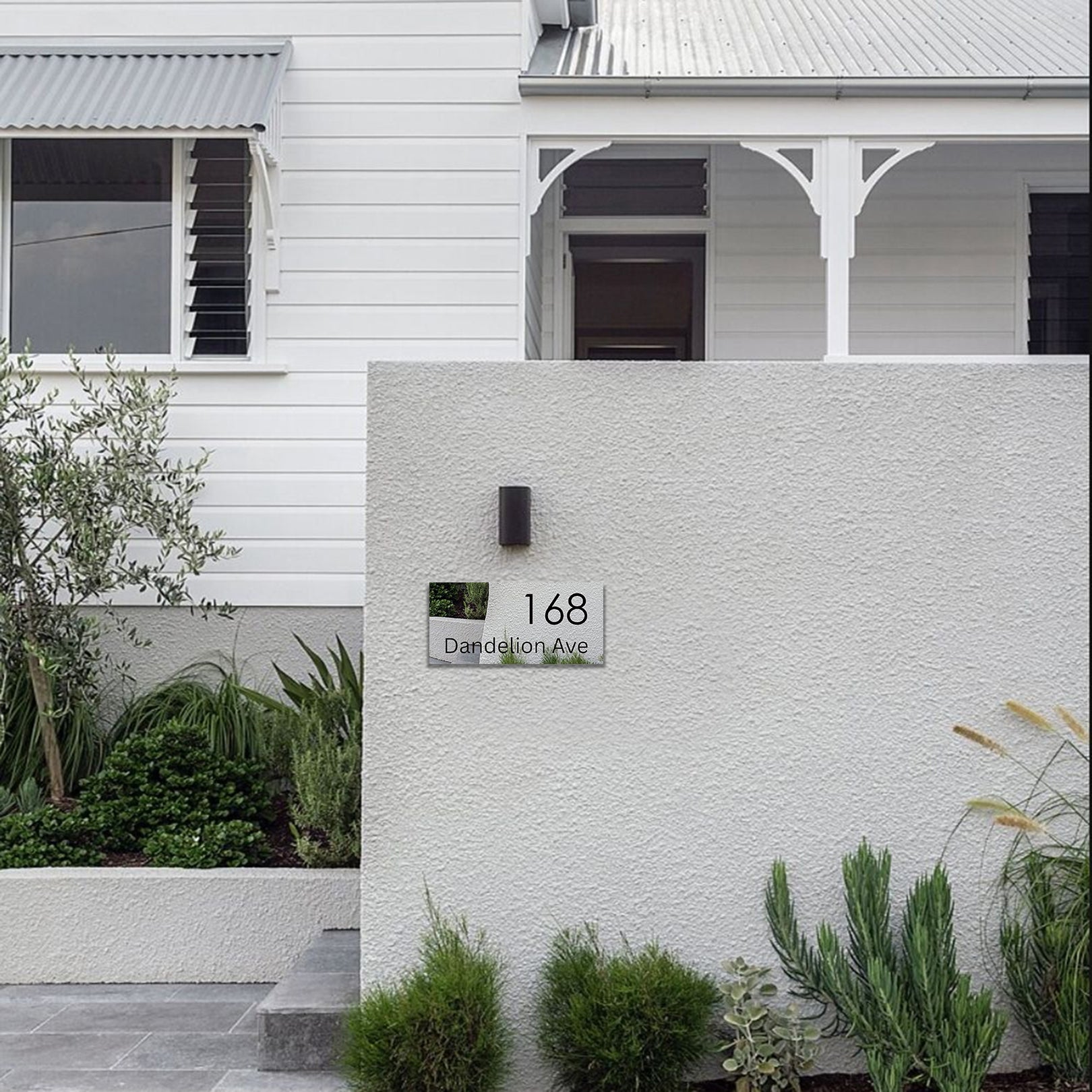 Luxury meets durability: 316 marine grade mirror‑polished stainless steel, 300mm (W) x 140mm (H), with your address laser cut for bold, crisp apertures. A backing plate in your chosen colour sits behind the cut‑outs to define the “text”. The mirror finish delivers a premium look with exceptional corrosion resistance — perfect for coastal homes.