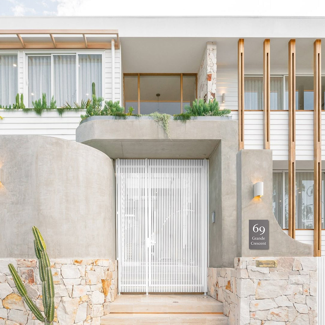 A bold and modern house sign made from genuine COLORBOND® steel in Basalt. Measuring 400mm wide x 600mm high, this large-format plate is designed for clear street visibility and features your custom address applied in industrial-grade vinyl.