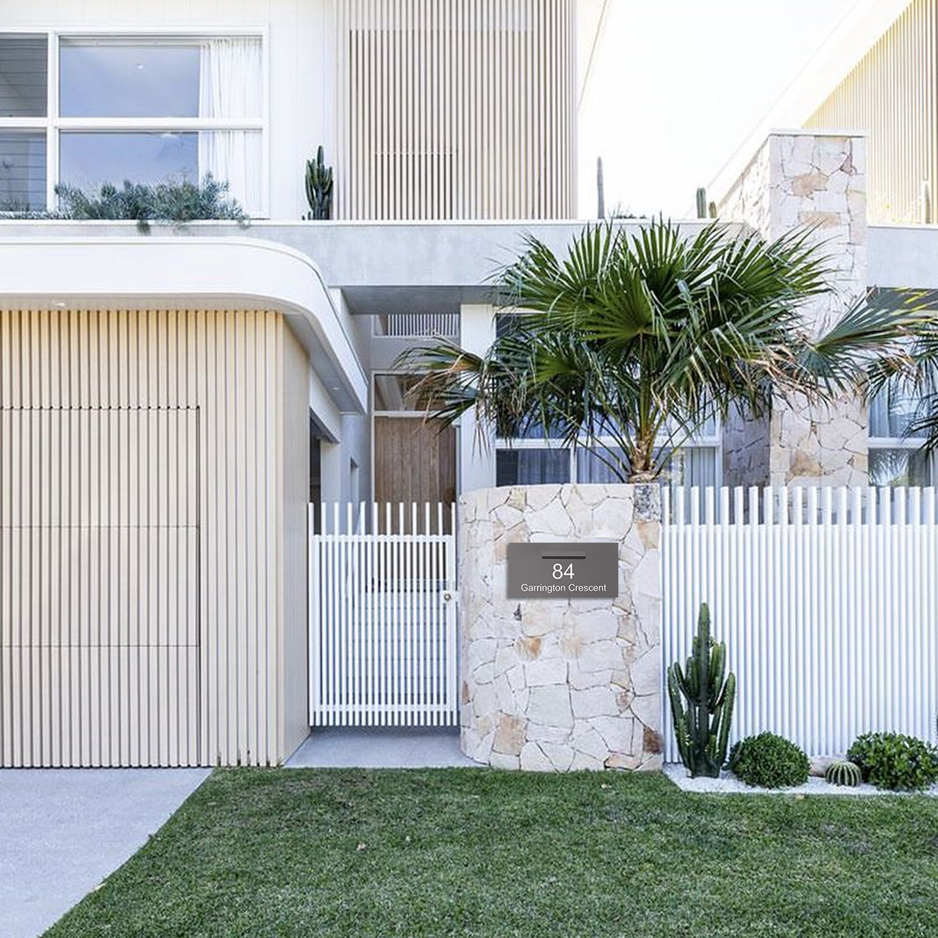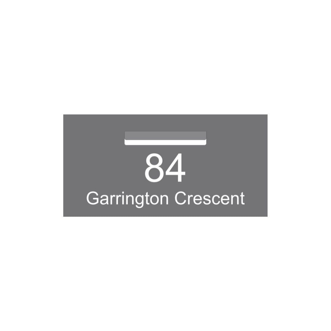 A 600 × 300mm Basalt faceplate with a 240mm mail slot centered for a perfectly balanced look. Laser‑cut address text is bold and legible with your selected backing colour behind.