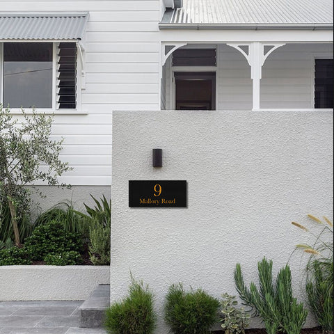 A bold, modern house sign crafted from genuine COLORBOND® steel in Black. Measuring 600mm wide x 300mm high, this large-format plate is customised with your address in industrial‑grade vinyl, delivering crisp, high‑contrast lettering in the colour and font of your choice (popular colours include White, Silver, Gold, and Copper).
