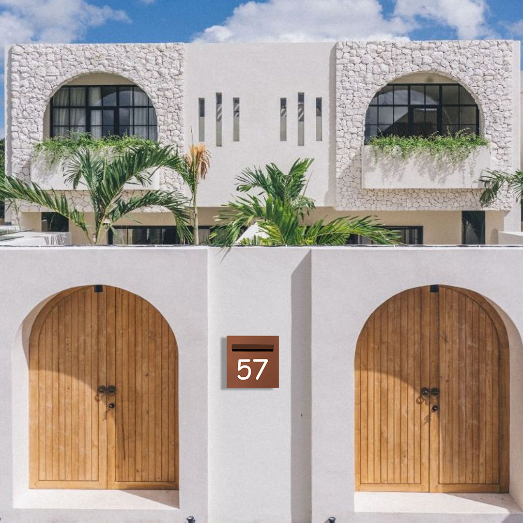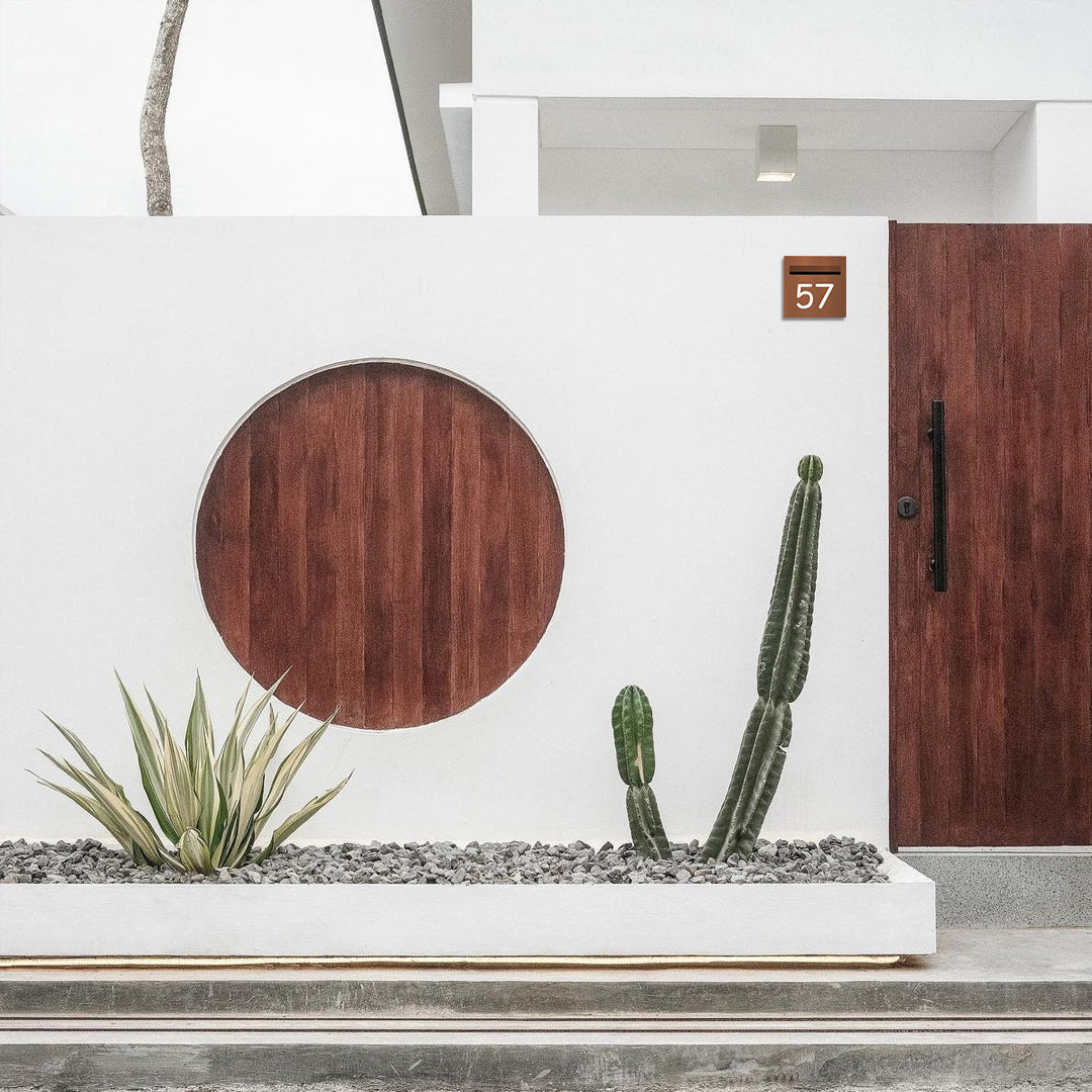 Compact and warm, this corten‑look square faceplate (300mm W x 300mm H) features a 240mm mail slot and crisp laser‑cut address characters. Enjoy the rustic steel aesthetic without rust staining or maintenance.