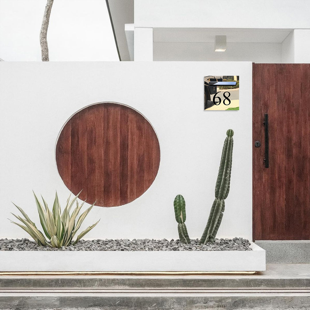 A statement mirror‑polished 316 stainless square (300 x 300mm) with a 240mm mail slot. Laser‑cut address characters create bold, through‑cut detail against a high‑gloss, reflective surface.