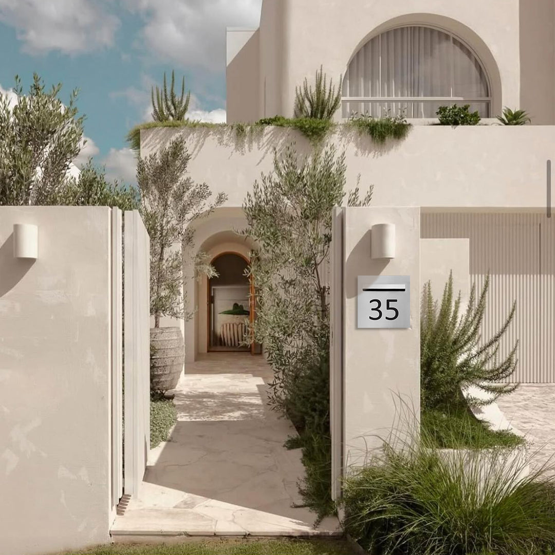 Soft and contemporary, Shale Grey in a 300 x 300mm square with a 240mm slot. Laser‑cut address text reads clearly against the calm neutral, suiting coastal and urban façades alike.