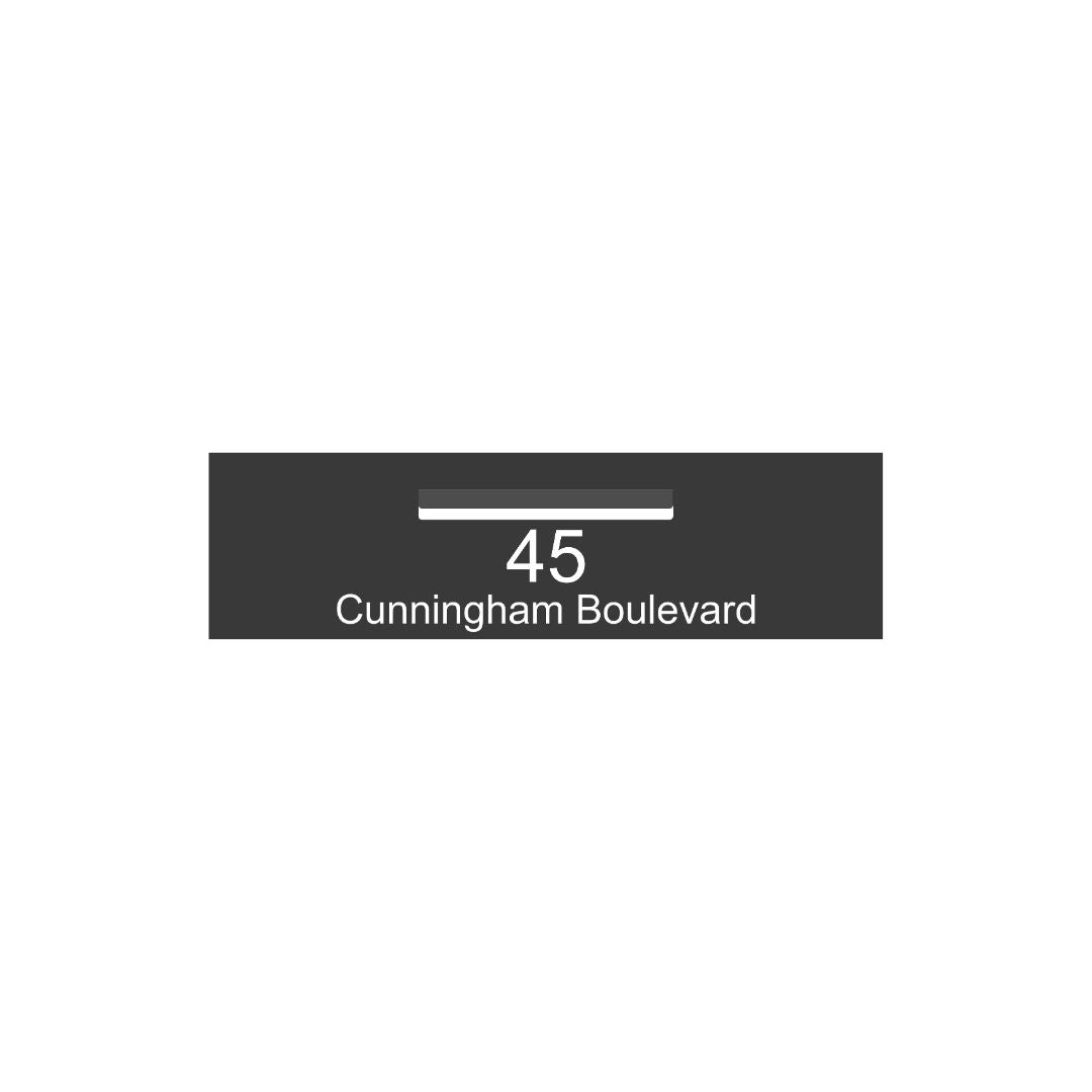 A Black faceplate (900 × 250 mm) with a central 340 mm mail slot. Permanent laser-cut address text provides high-impact visibility.