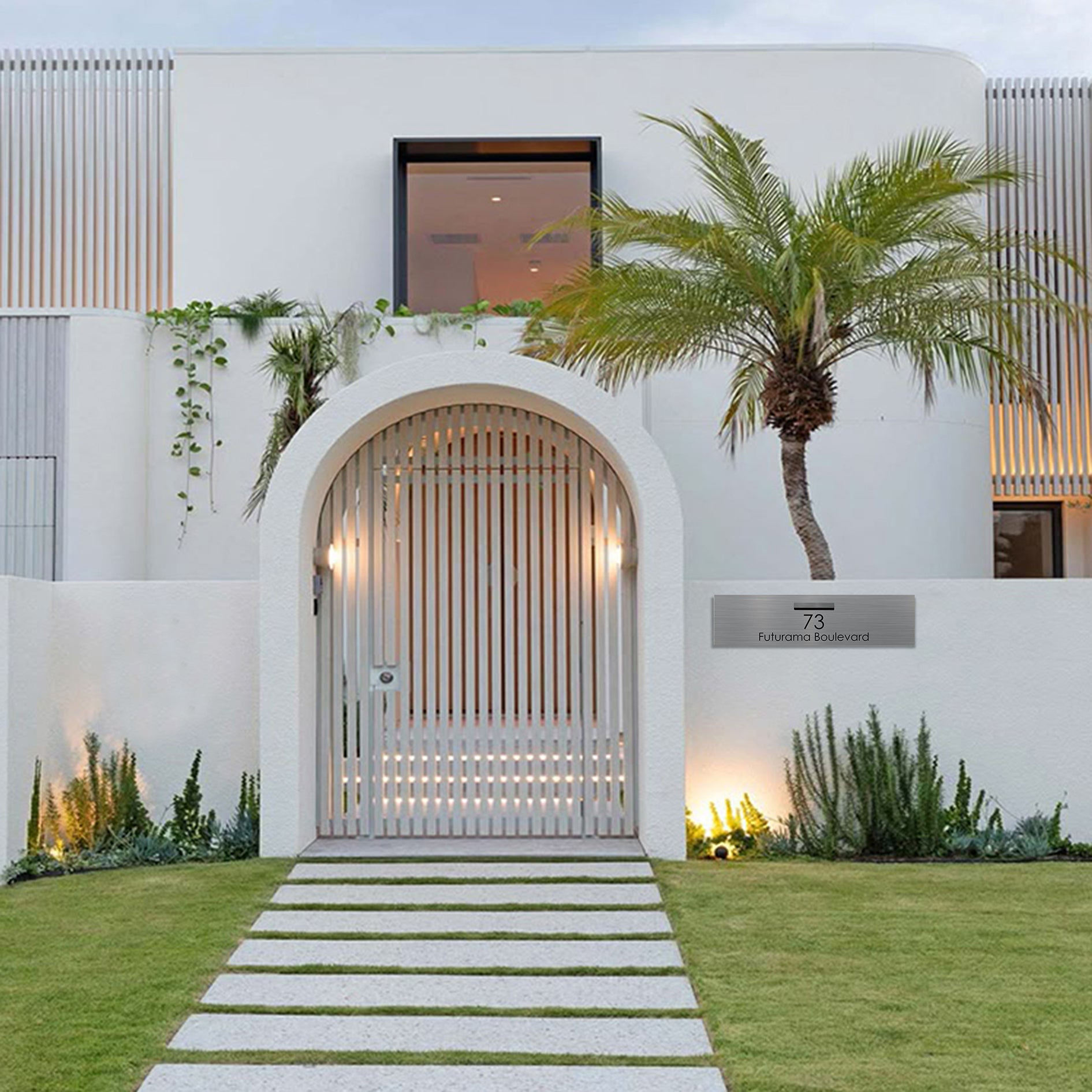 A central 240 mm slot set in 1200 × 300 mm 316 brushed stainless, with laser‑cut addressing for modern, high‑contrast visibility.