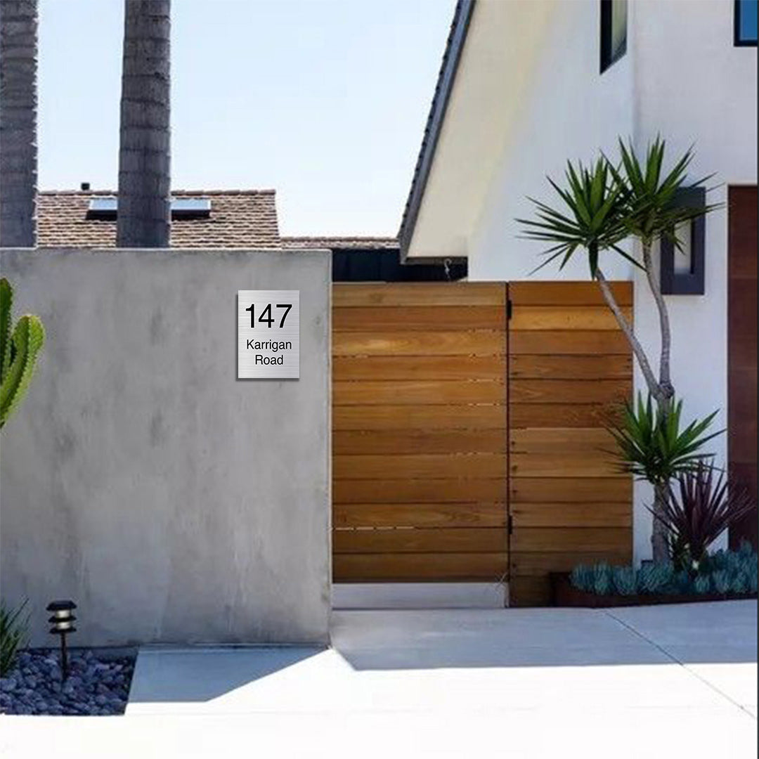 A premium signage plate made from 316 Marine Grade stainless steel with a horizontal brushed finish (grain runs left-to-right). Measuring 450mm wide x 600mm high, it’s laser etched with your custom address, producing crisp black text that contrasts beautifully against the brushed silver surface.