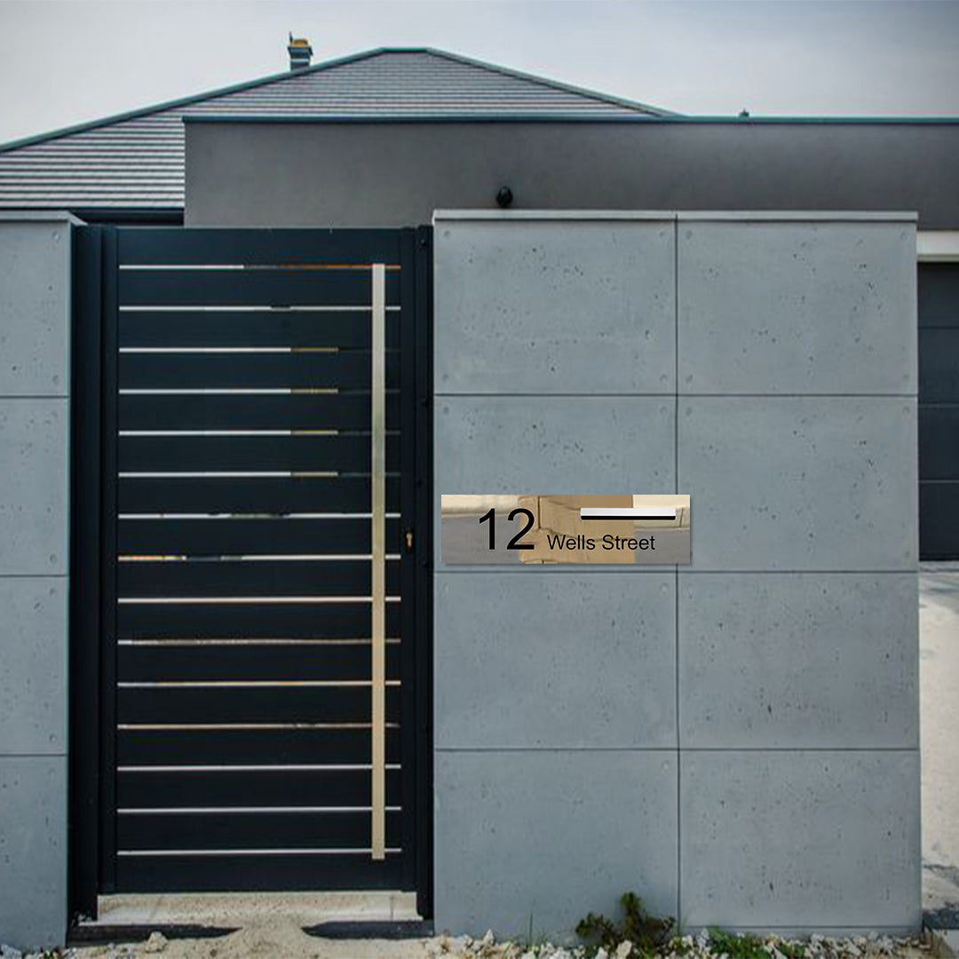 A statement‑finish mirror‑polished 316 stainless faceplate, 900 × 250mm, with a 340mm mail slot. Laser‑etched address text produces a crisp, permanent mark on the high‑gloss surface.
