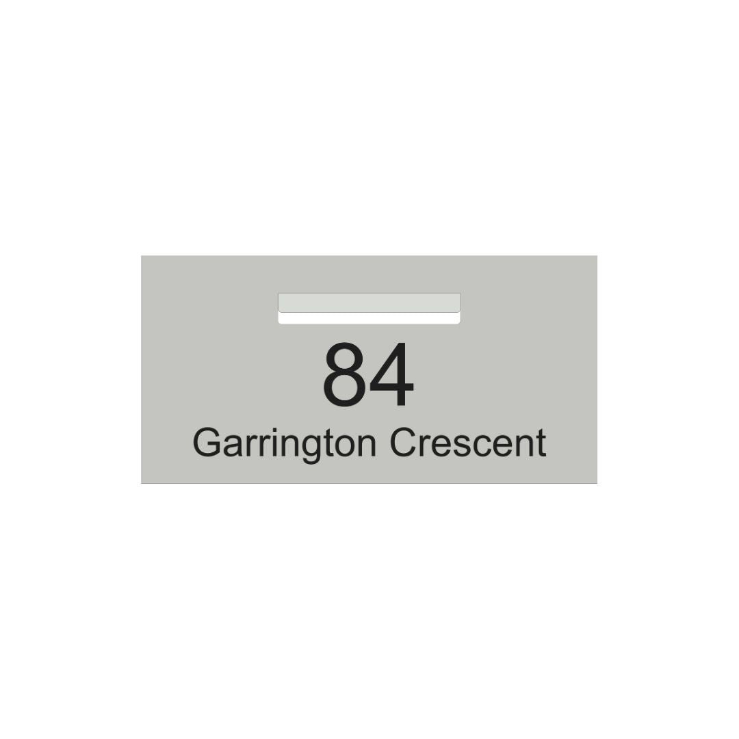 Shale Grey with central 240 mm slot and laser‑cut address.